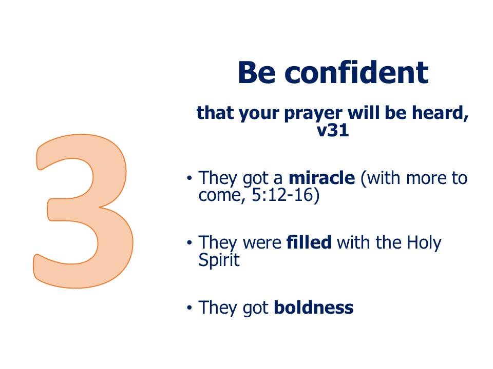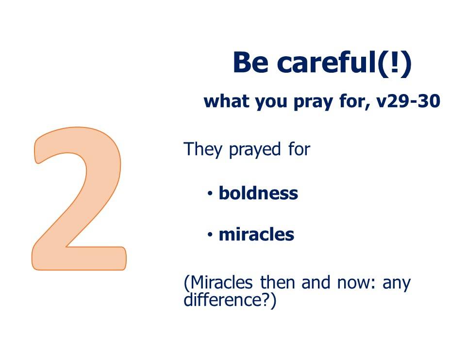 ‘The prayer is not primarily that the opponents will be brought to naught. Rather, on the assumption that this will inevitably happen, the church asks for strength to carry on witnessing during the time while they still continue to be able to exercise their opposition. The Lord’s servants need courage (v13) to stand up to the threats against them and continue to proclaim the Word. At the same time, they are conscious how much the effectiveness of their preaching was aided by the healings and other miraculous signs worked by the Lord through the name of Jesus, and they prayed for the continuation of these.’ (I.H. Marshall)