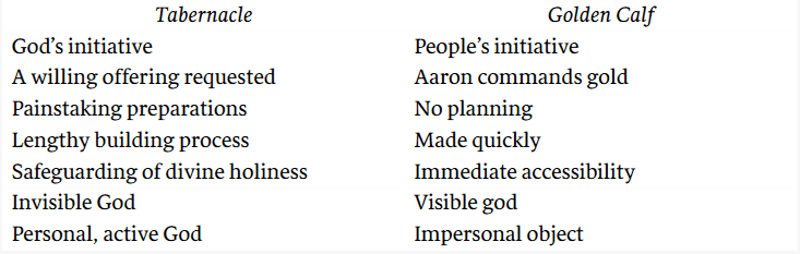 Fretheim notes the contrast between the construction of the tabernacle and that of the golden calf (recorded in Ex 32-33:6, between the two accounts of the tabernacle:
